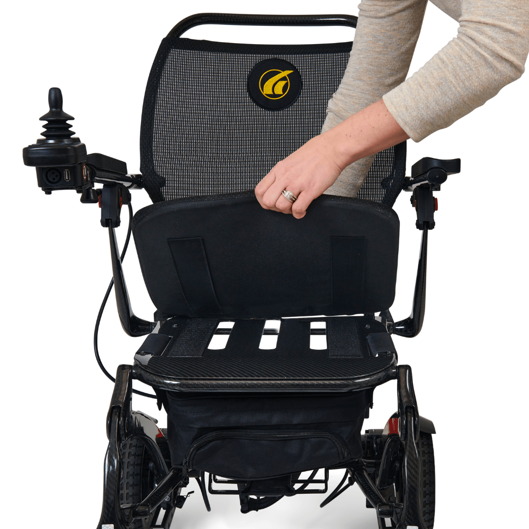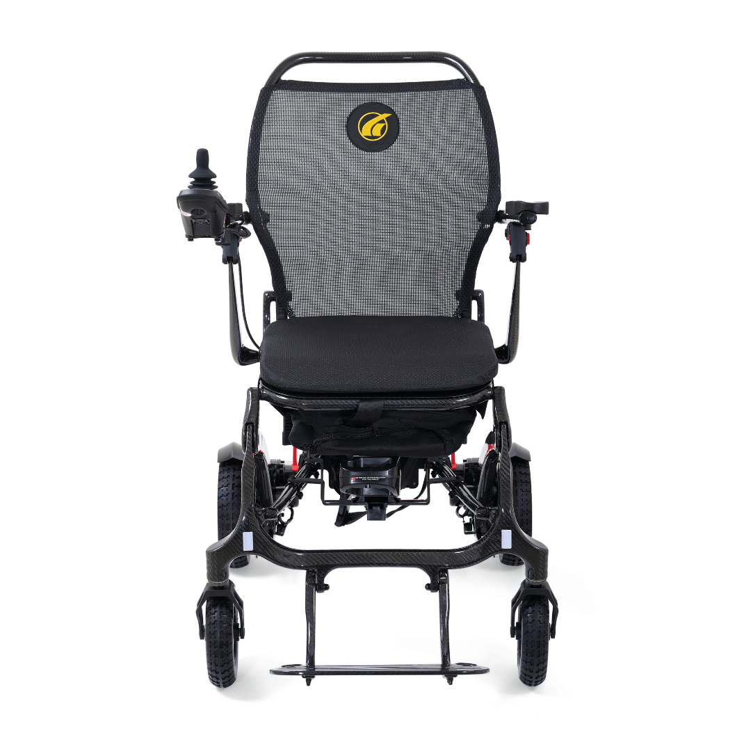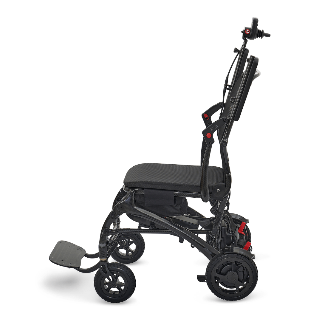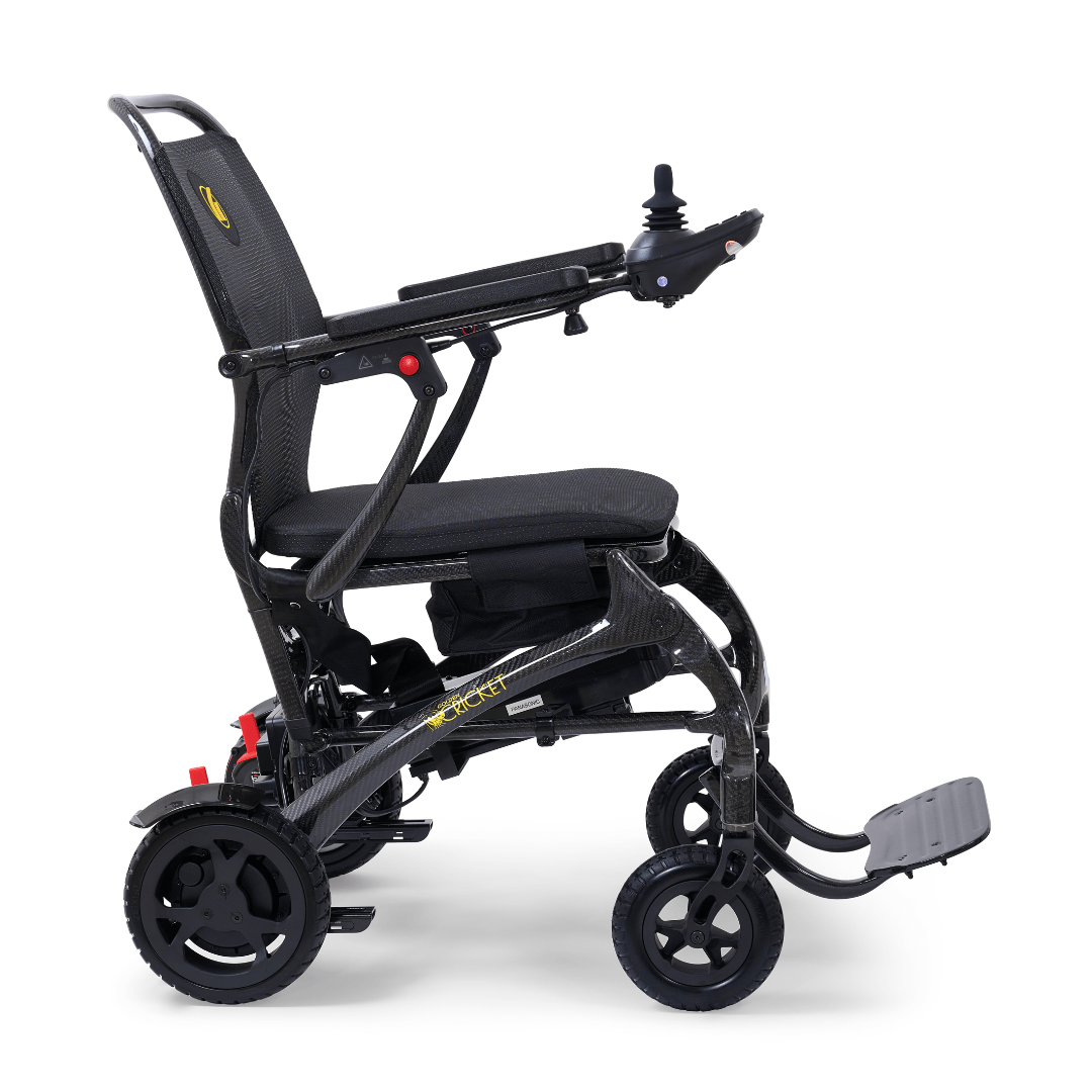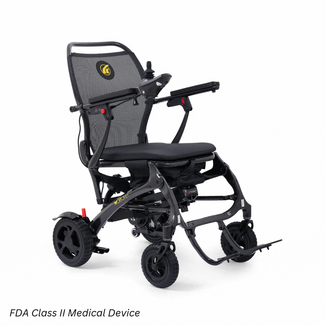 The Cricket Power Wheelchair is stylish, agile, and extremely portable. Crafted with an incredibly strong yet lightweight 100% carbon fiber frame, the Cricket weighs as light as 33 lbs. making travel a breeze! The slim sporty design is perfect for navigating indoors and out while sightseeing, shopping, or dining.
