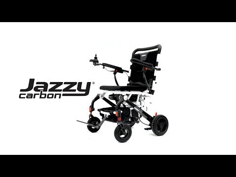 The Jazzy Carbon is highly portable and weighs approximately 43.6 lbs with its battery, or 39.6 lbs without. It features a compact base that folds and unfolds in a few simple steps, making it easy to store in a car trunk or overhead compartment on a plane.